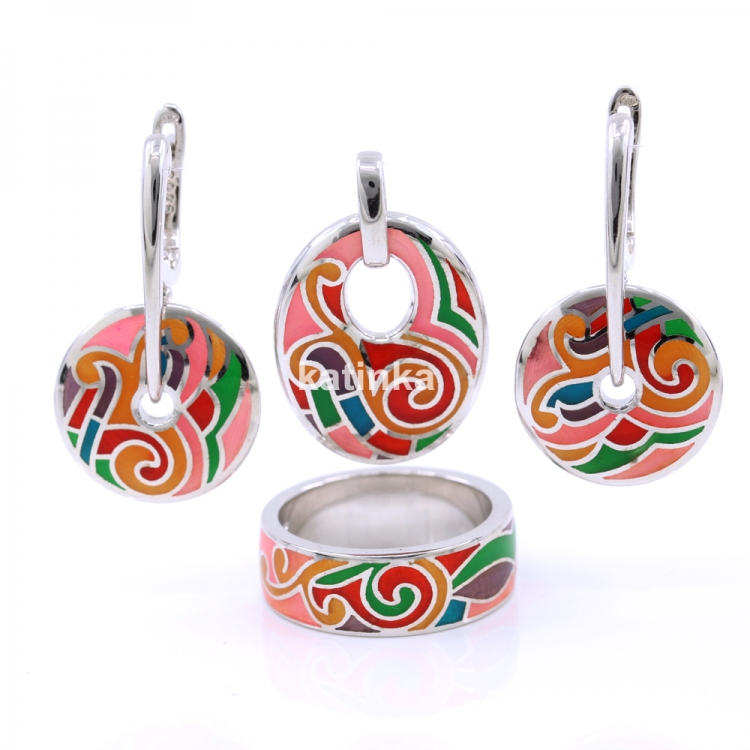 Set of 925 silver rhodium-plated with enamel and zirconia crystals, consisting of a ring, size 58 (18.4mm inside), pendant: 22.5x18mm, earrings: 31x17mm, made of 925 silver, total weight: 19.85 grams, the products are verified, marked 925 and registered ANPC Directia de Metale Pretioase.